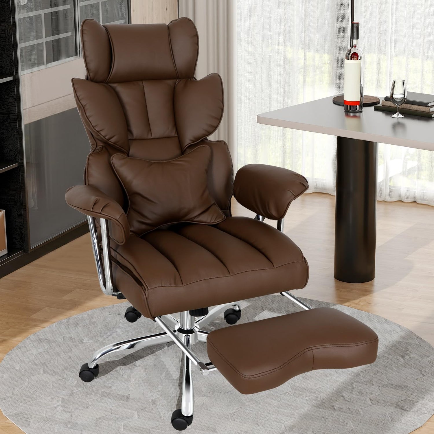 Big and Tall Office Chair 400lbs PU Leather Computer Chair with Footrest and Lumbar Support Executive Chair Swivel Chair Desk Chair Adjustable Height & Reclining Backrest Brown