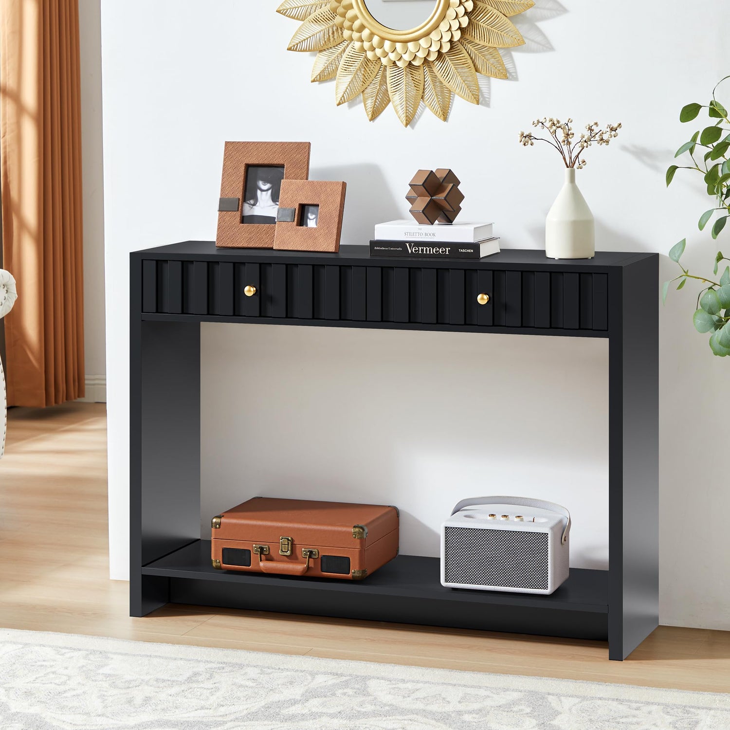 - Elegant Fluted Console Table: The AVZEAR foyer tables for entryway combine classic mid-century aesthetics with modern functionality. Its sleek finish, clean lines, and charming fluted drawers add sophistication. Perfect as a mid century slim console table, narrow entryway table, or hallway accent table, it’s available in walnut and black colors, ensuring a match for various living room furniture styles.