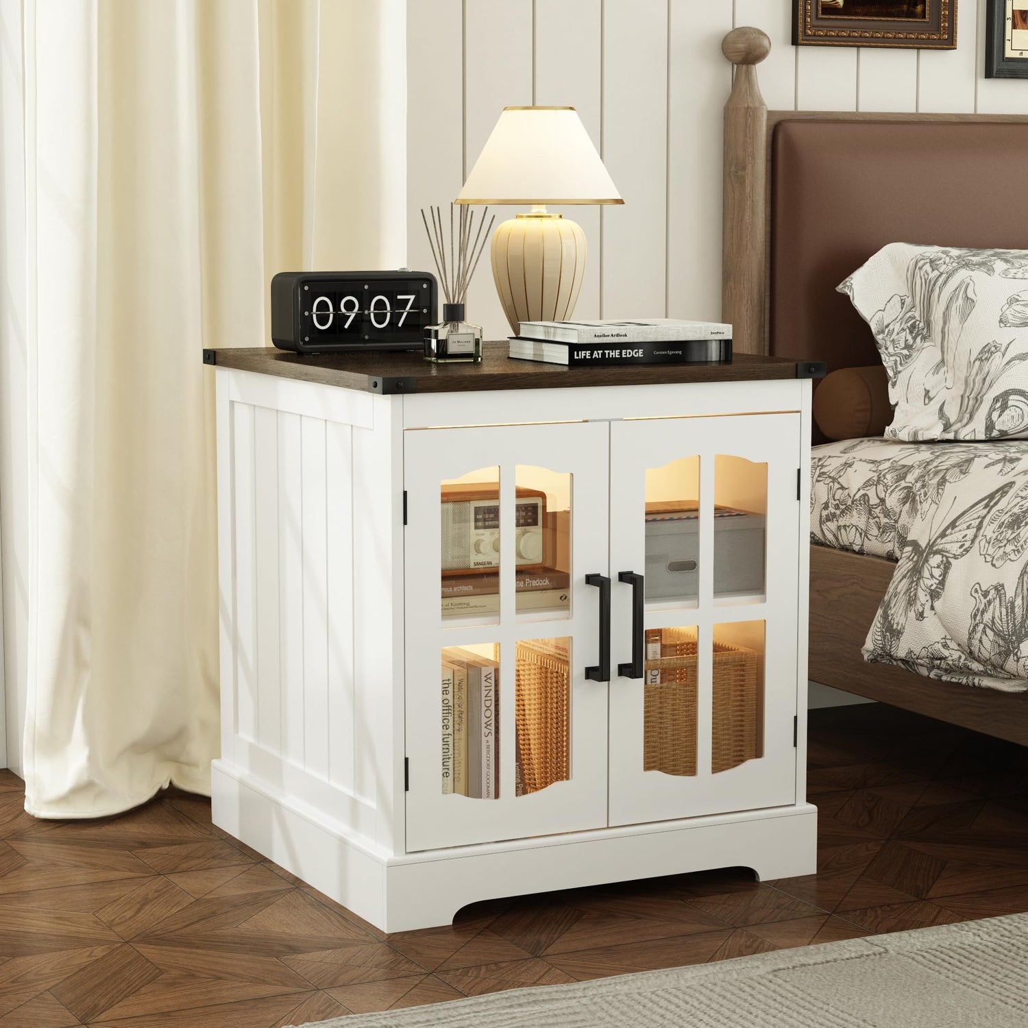 - For this end table, we've blended a serene soft white with a warm brown to embody the Farmhouse style. The LED light strip subtly enhances the ambience and provides gentle illumination. The vintage glass door and detailed sidelines introduce a touch of refinement, transforming it into both a functional piece of furniture and a work of art.