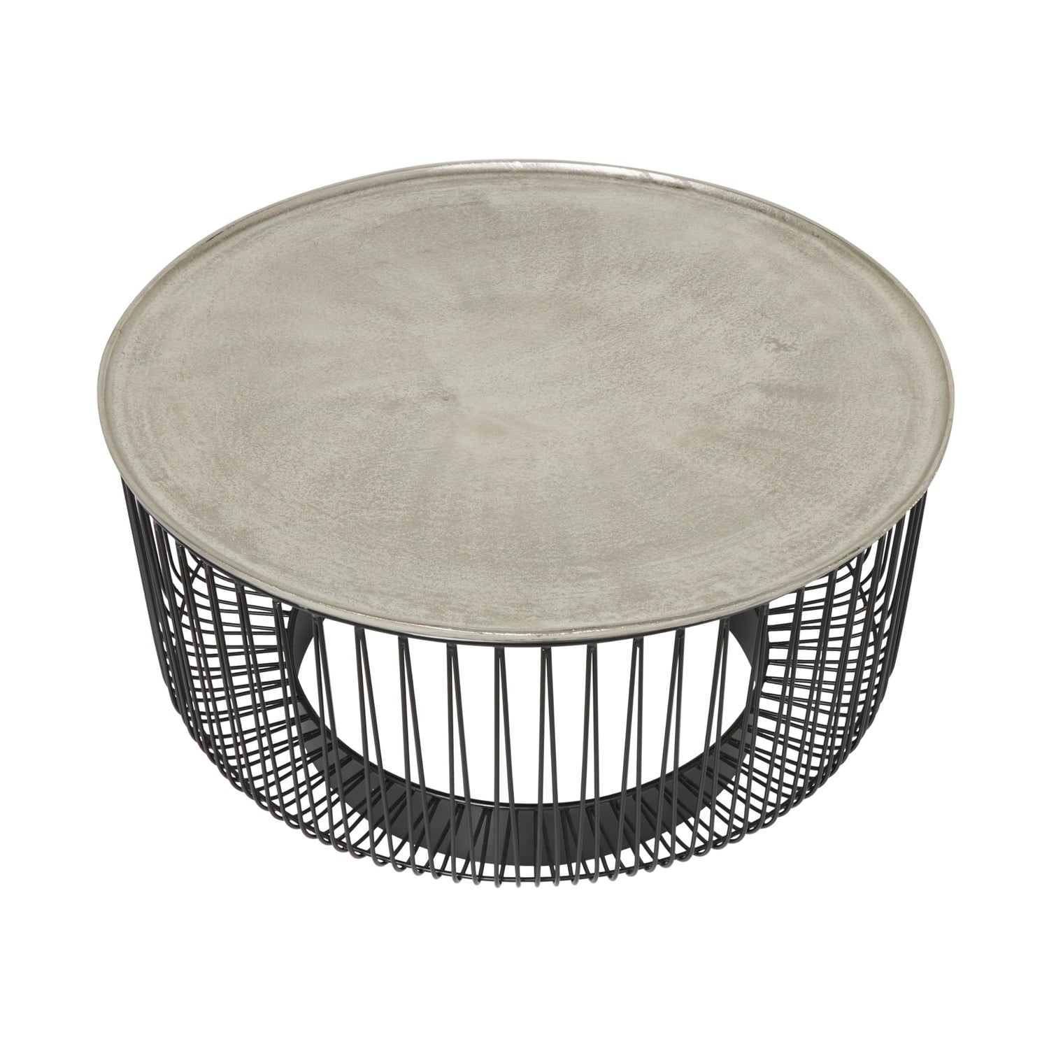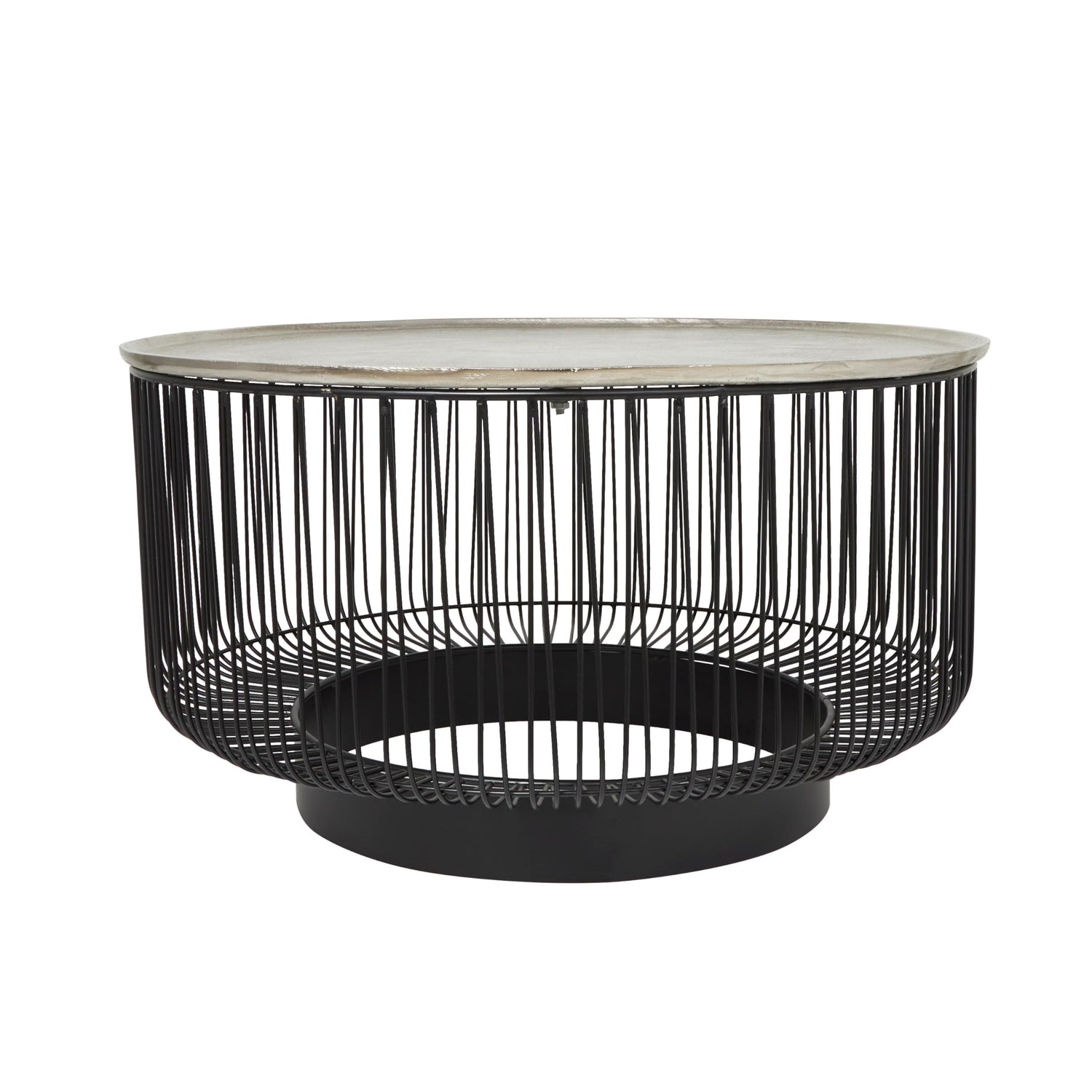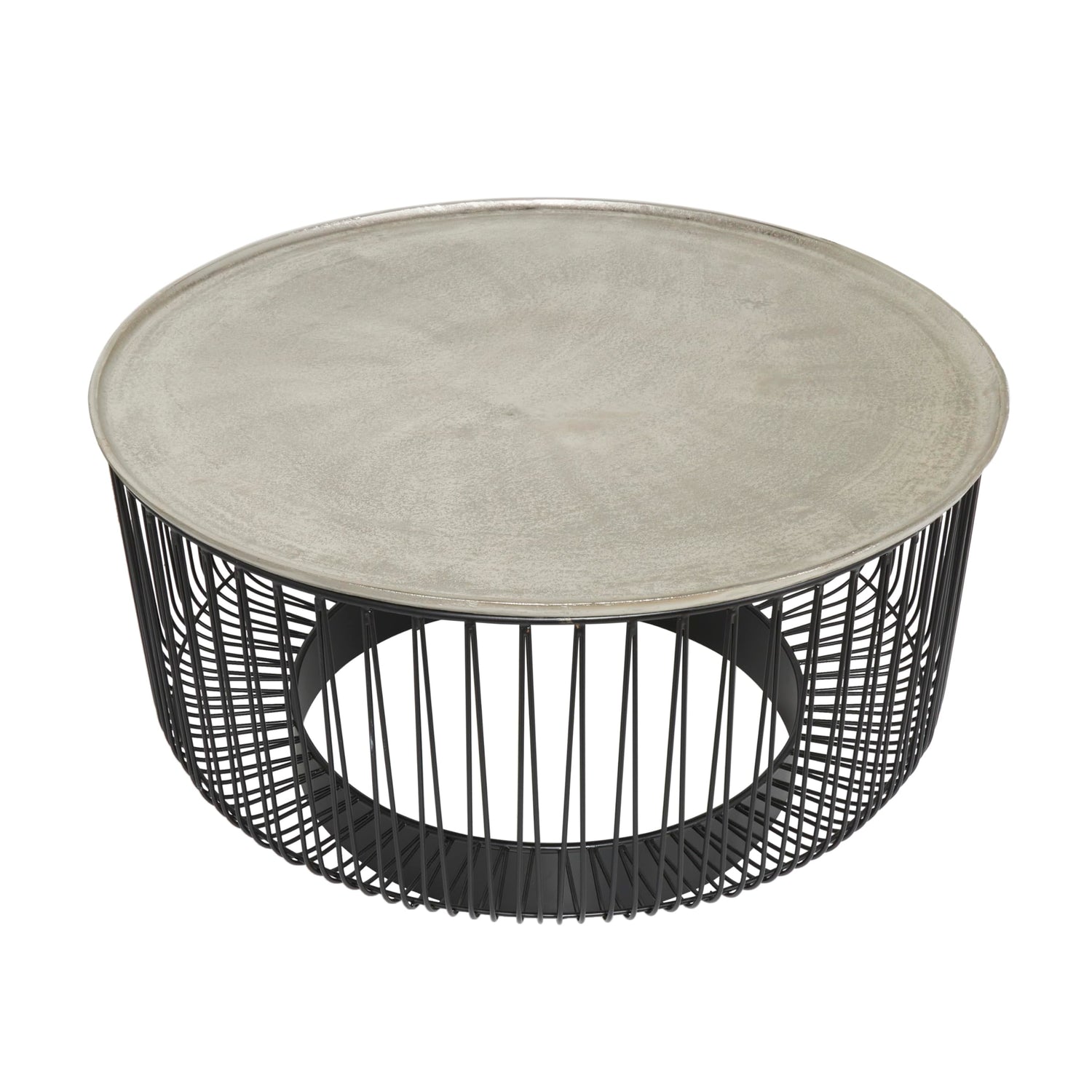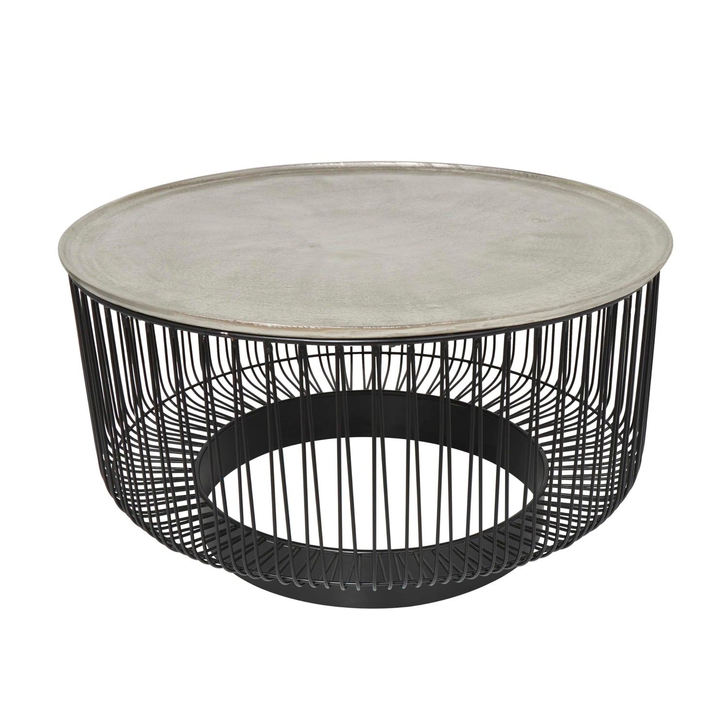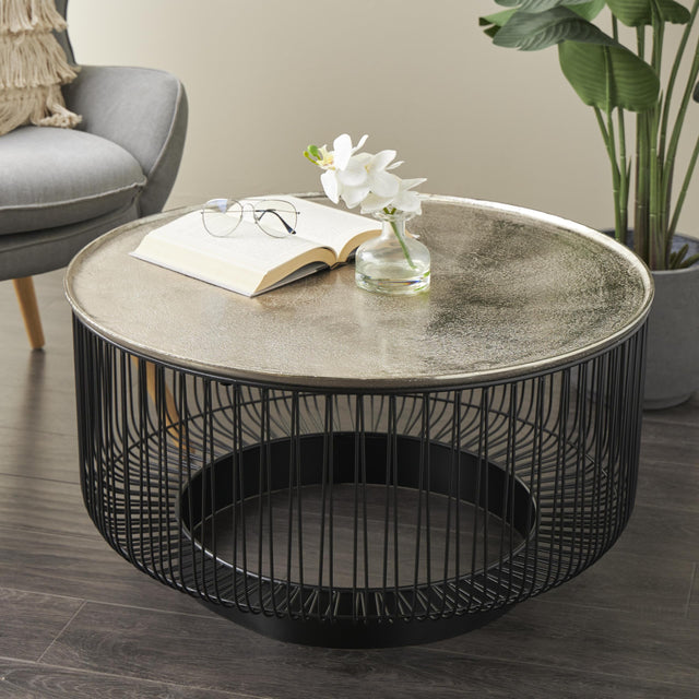 Details: Every material used in this contemporary home table has been crafted with precision and attention to detail with the beautiful aluminum top seamlessly welded to the cage-like base. Matte black center table for living rooms has a round shape that adds a soft and inviting touch to the overall aesthetic, while the industrial design elements bring a contemporary edge to the space. Wipe clean with a dry cloth. This geometric table can serve as a centerpiece in your living room or a convenient place to set drinks and snacks during gatherings. This item ships in 1 carton. Suitable for indoor use only. This item ships fully assembled in one piece. Maximum weight limit is 100 lbs. Made in India. This is a single black colored living room table. Contemporary style.