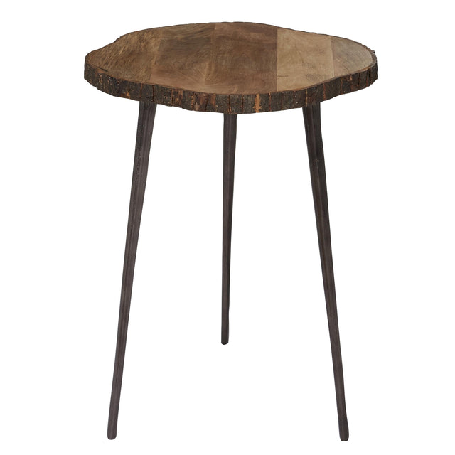 - ROUND SMALL TABLE: This mango wood accent table features unique elements like a slice of tree trunk tabletop paired with tapered metal tripod legs, adding to its rustic charm