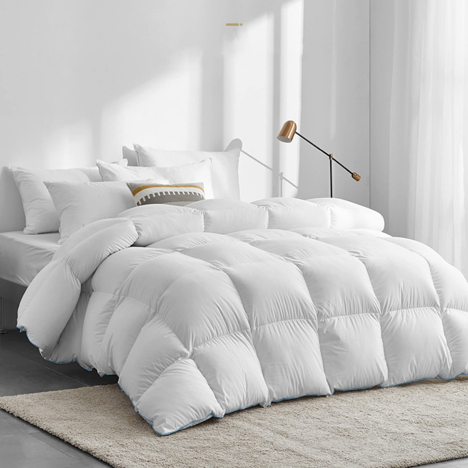 - · DELUXE SOFT & COMFORT - Our feather down comforter shell is made of luxurious, brushed and ultra-soft 400 Thread Count poly-cotton blend fabric by innovative technology. Breathable, plush and silky touch provides you a noiseless and super cozy night sleep. 8 corner tabs to easily attach duvet covers.