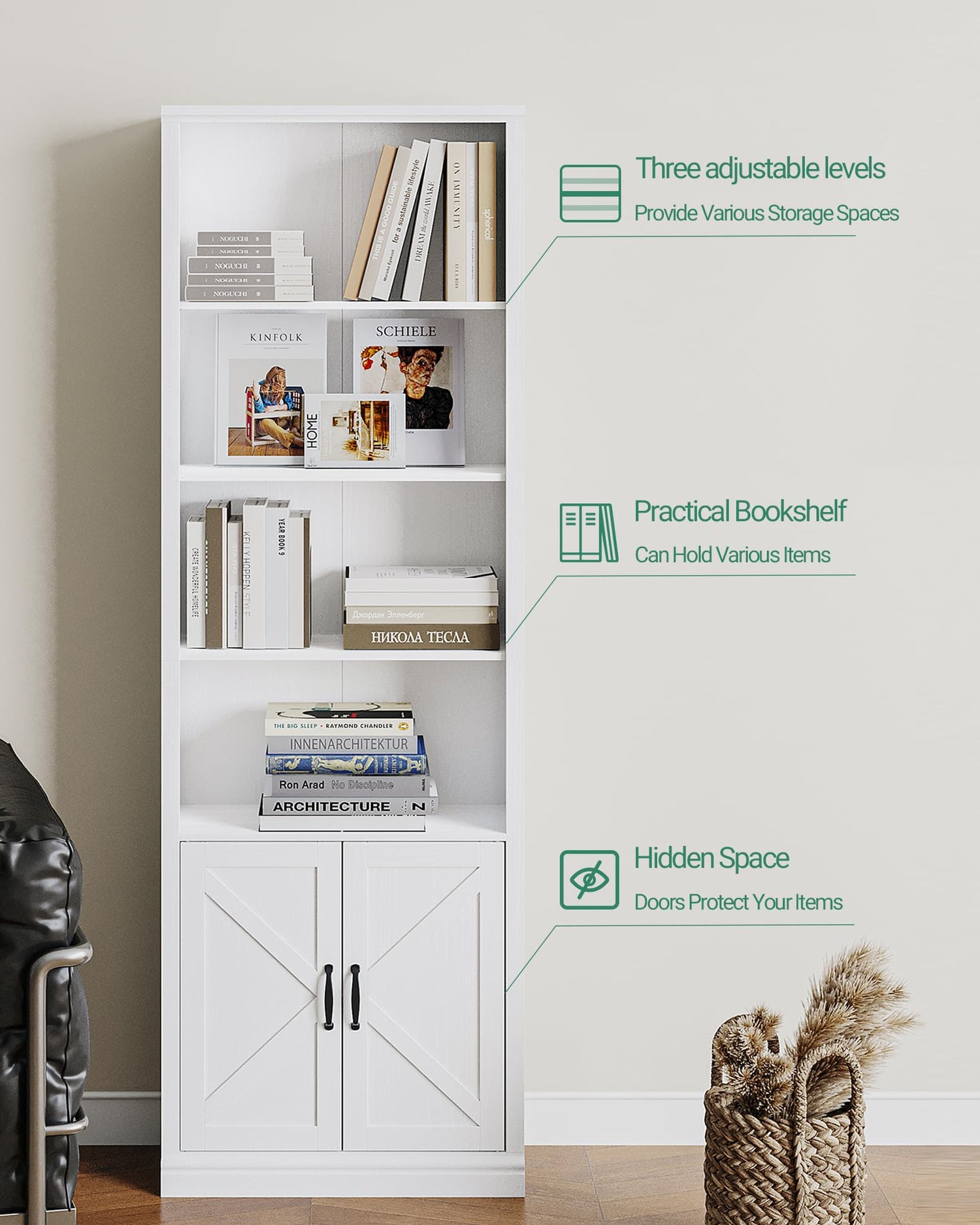 - Adjustable partition: The bookshelf has 2 fixed shelves and 1 adjustable shelf, with 3 upper layers to accommodate items of different sizes and shapes. The movable board can also be removed and placed in the bottom cabinet, creating two usable spaces at the bottom.
