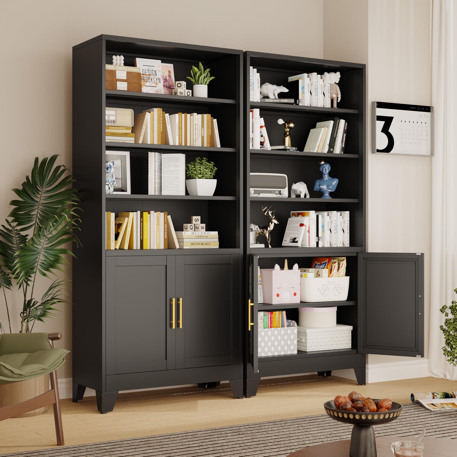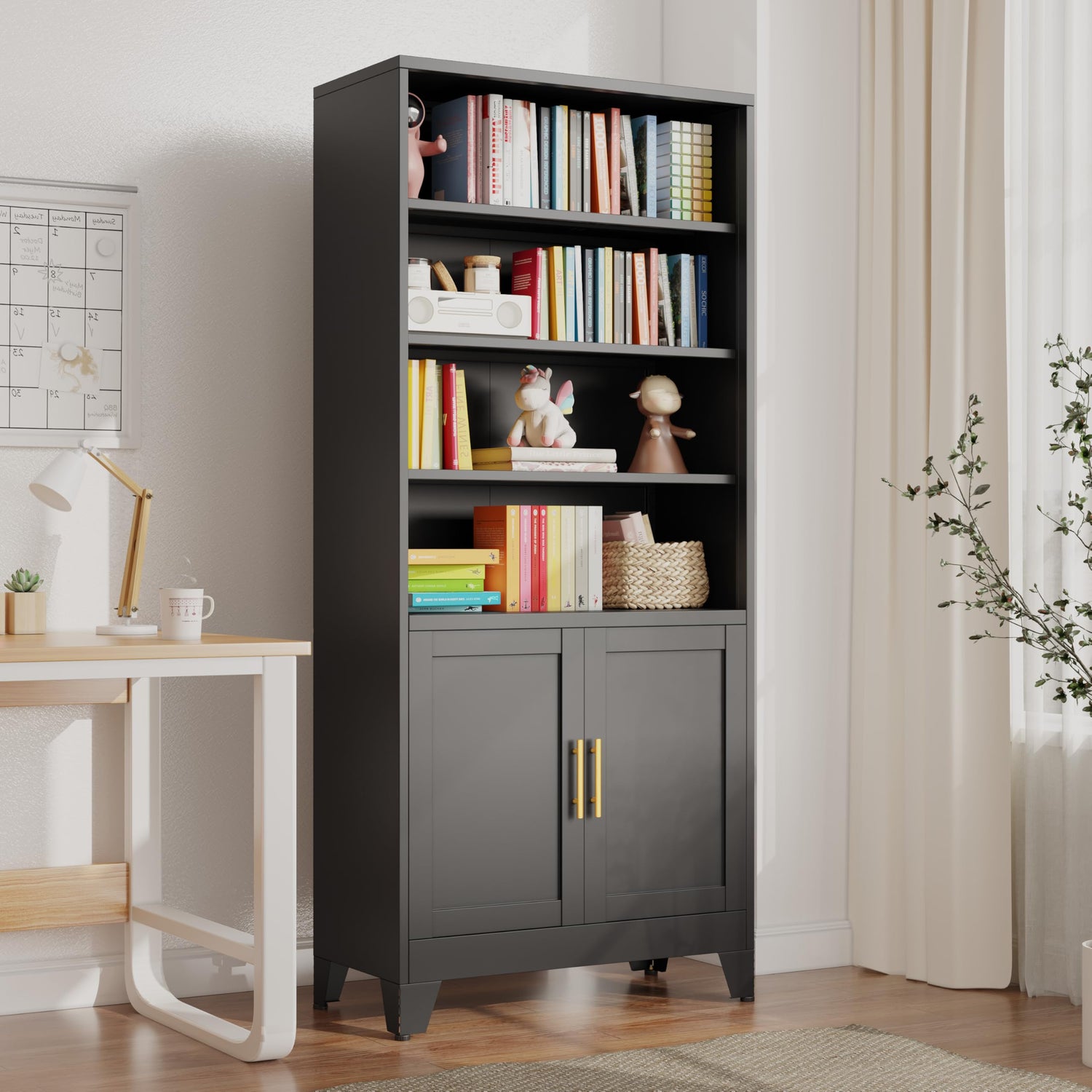 75 Inch Tall Bookshelf with Doors, Metal Bookcase with Storage Cabinet