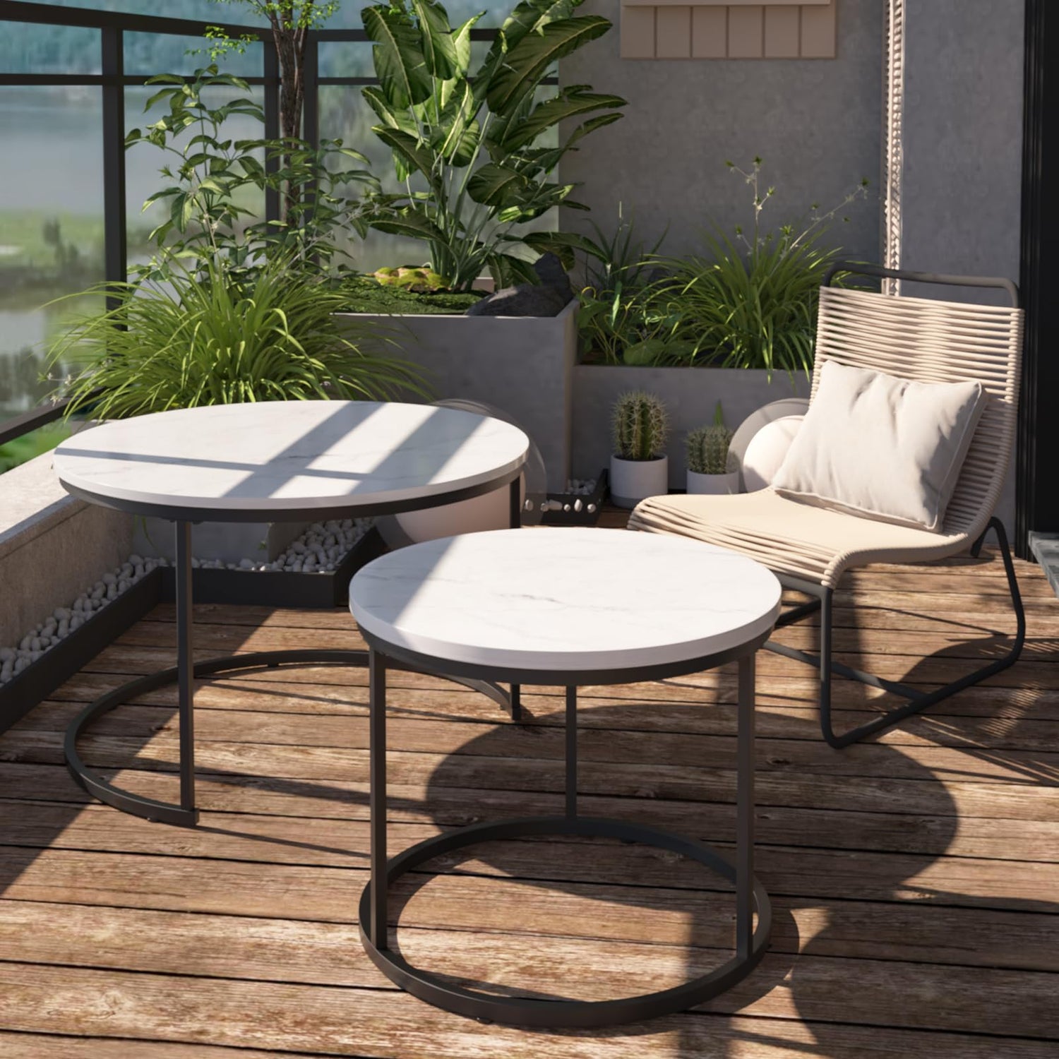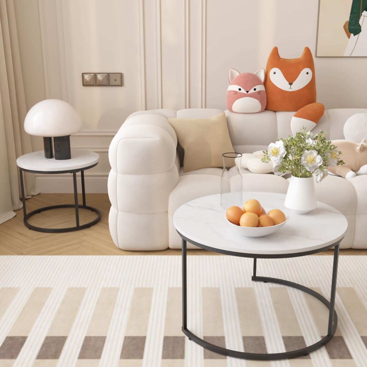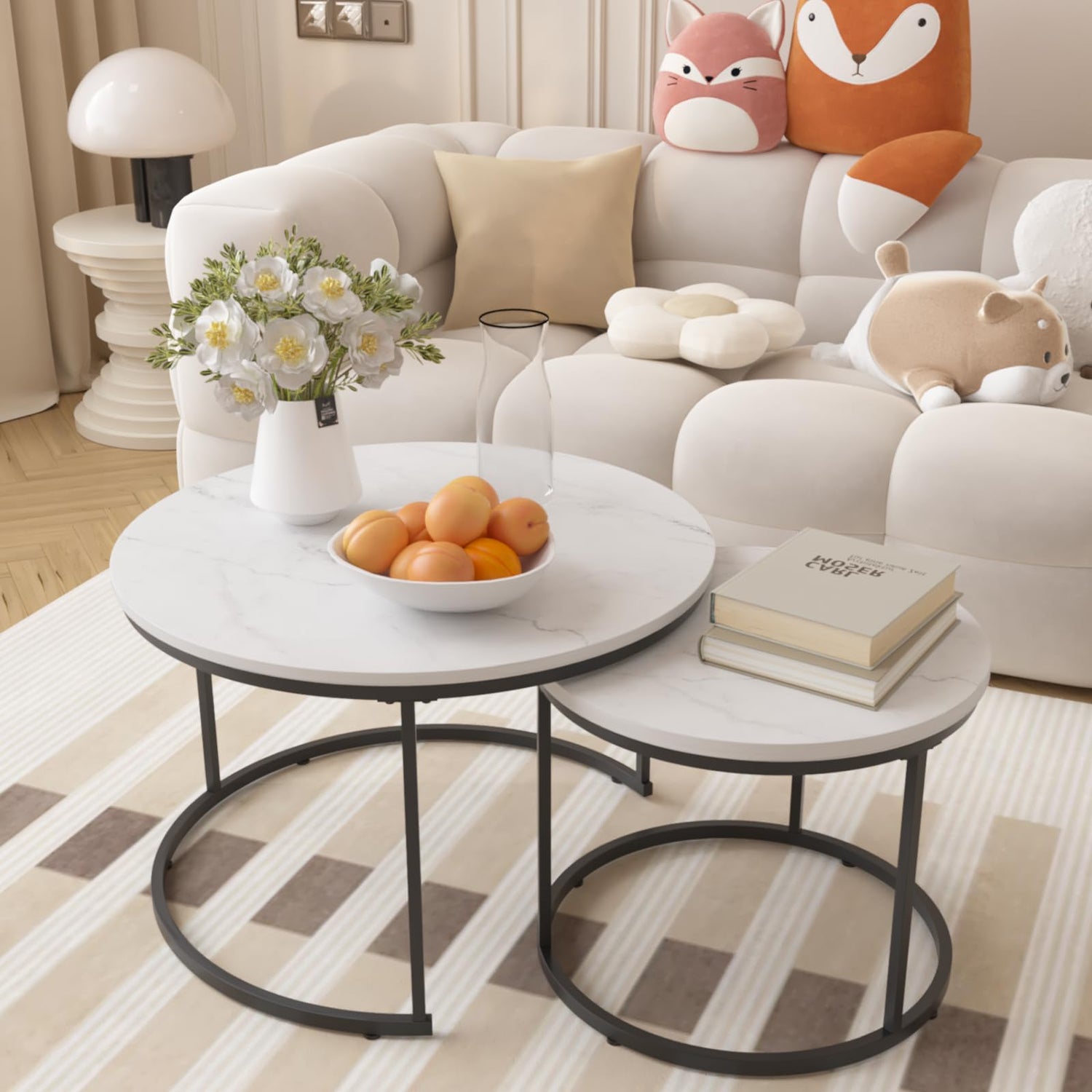 - Round Nesting Coffee Table Set of 2: This set includes two white round tables of different sizes, allowing you to distribute them individually around the room or nest them together for more space-saving convenience.