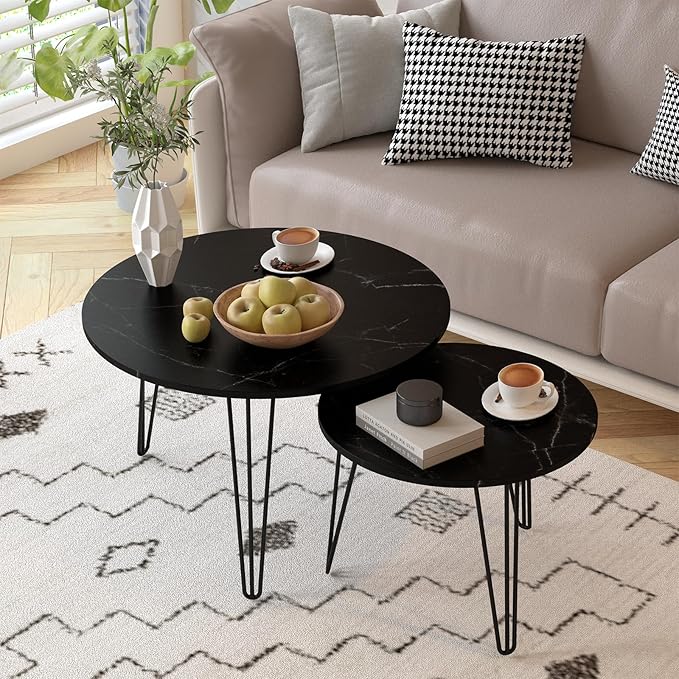 - Stylish Round Coffee Table: This coffee tables for living room is made of a sturdy MDF tabletop and iron frame, this stackable coffee table can reach a load capacity of up to 120 LBS. The modern design of these round marble coffee tables complements various home styles, adding both functionality and aesthetic appeal.
