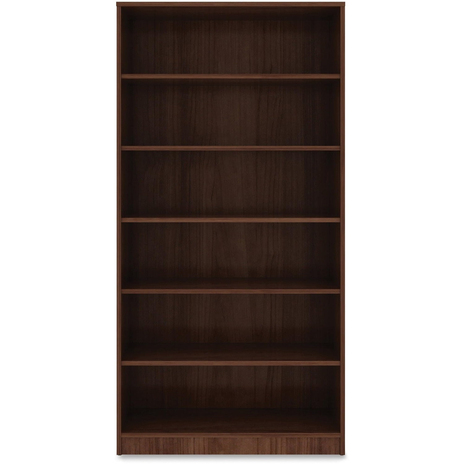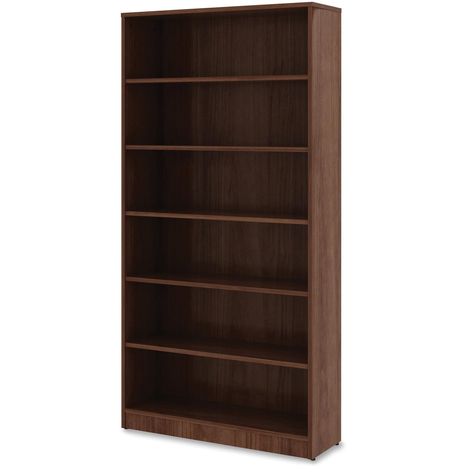 Sturdy, six-shelf bookcase offers high-quality laminate construction and a contemporary design. Shelves are 3/4" thick and made of 18mm thick, medium-density fiberboard with thermally fused, Walnut laminate for long-lasting use. The visible, one-piece backing behind the shelves is made with 3mm thick, medium-density fiberboard and matching laminate. Both sides are finished. The bookcase features five adjustable shelves, one fixed bottom shelf, square edges, and adjustable feet. Each shelf holds up to 75 lb.