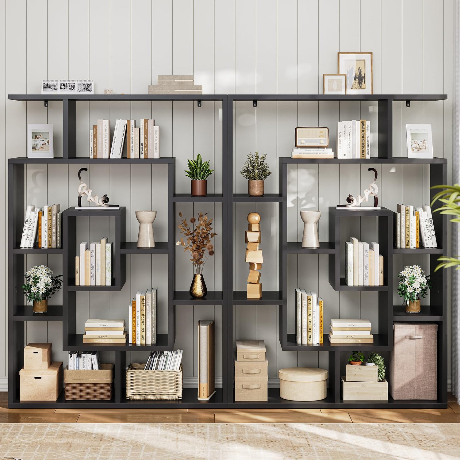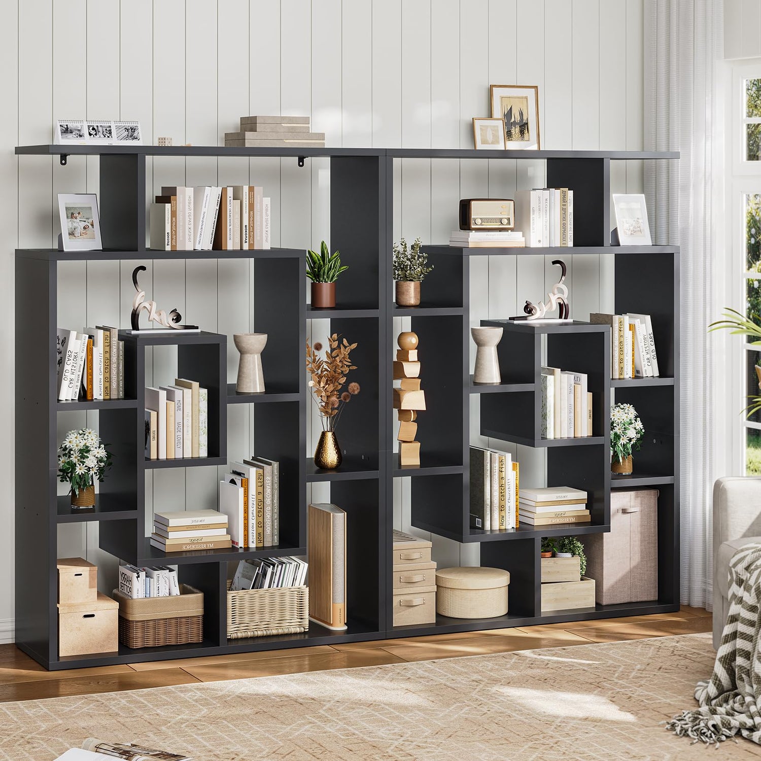 - With its unique geometric design, this book shelf creates a cohesive and visually appealing space. It has a very rich and diverse storage space. On the open bookshelf shelves, you can place books, toys, plants, collectibles and some other daily necessities. It is not only a bookshelf, but also a living room isolation shelf, a collection shelf, and more.