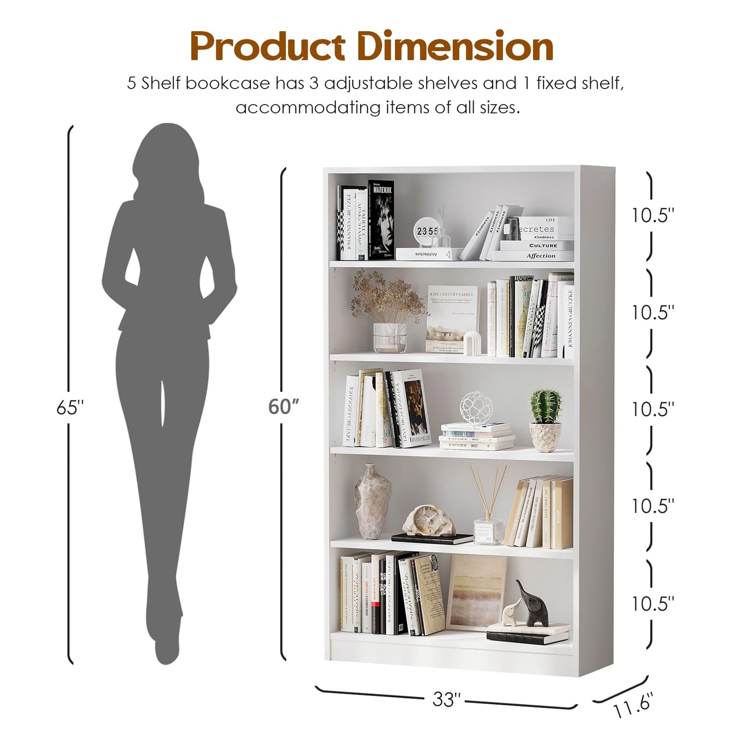- Spacious Design: With dimensions of 33''W*11.6''D*60''H and 5 tiers of storage space, this wood bookcase effortlessly organizes and displays your books, magazines, toys, DVDs, or souvenirs. The 5-shelf bookcase includes three adjustable shelves and one fixed shelf offering flexible storage solutions to accommodate items of all sizes.