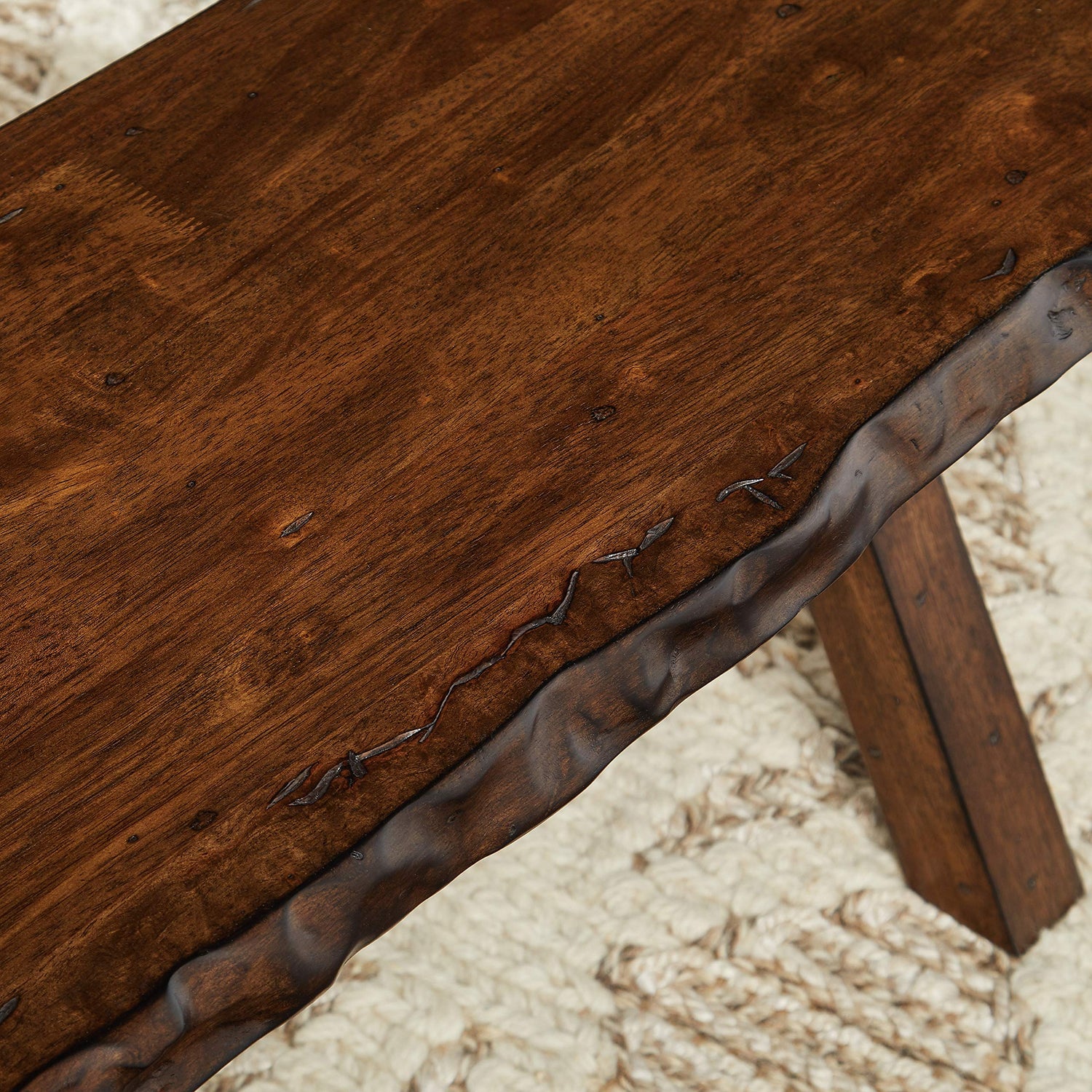 - Features a live edge along the length of the Bench
