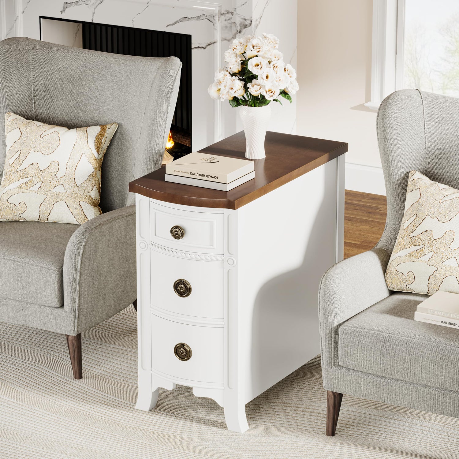 - Desktop of nightstand with saber-style front legs add an elegant touch to the overall design, adopts a solid wood grain with a natural and realistic texture, narrow end table paired with retro handles, featuring sunken and raised decorative details on the front, the side table resembles a work of art.
