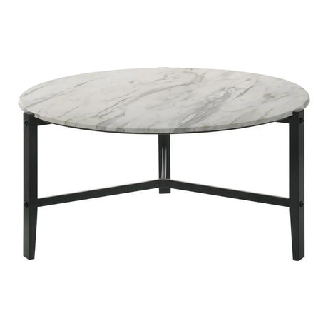 Zuko 36 Inch Round Coffee Table, Faux Marble Design, Interlocked Legs, White, Black