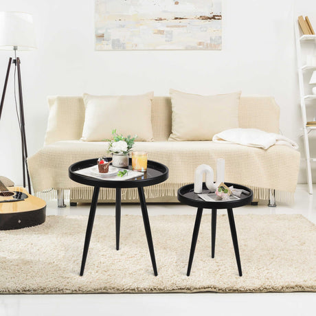 Round Side Table Set of 2,Black Marble Pattern Tray Shaped Small End Table