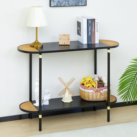 Black Metal Console Table with Rattan Decor, 2-Tier Entryway Table