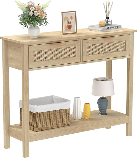 Rattan Console Table, Boho Entryway Table with Storage Drawers and Shelf