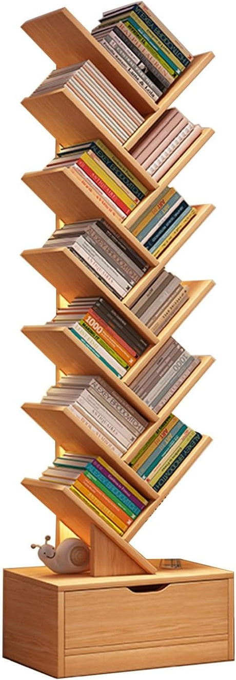 9 Tier Tree Bookshelf with Drawer, Retro Floor Standing Bookcase, Tall Narrow Bookshelves
