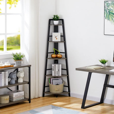 Rustic Tall Corner Bookshelf, 5 Tier Wood and Black