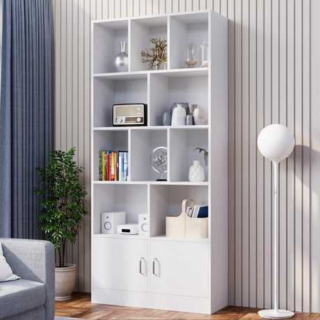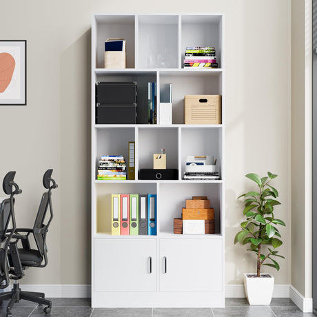 70" Tall White Bookshelf with 12 Cubes and 2 Doors, 4-Tier Open Shelf Bookcase