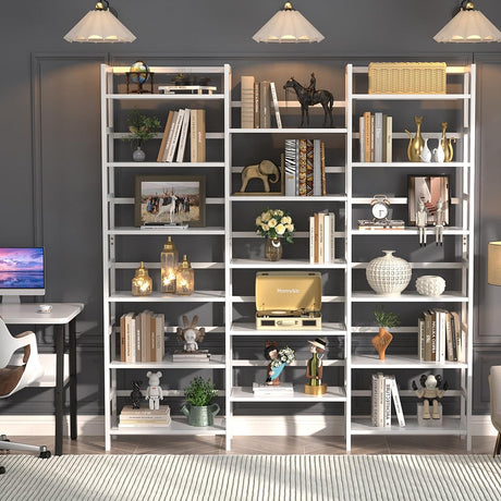 Triple 4 Tier Bookshelf, Industrial Bookcase with 11 Open Display Shelves Wide Book Shelf