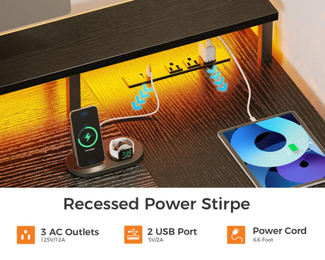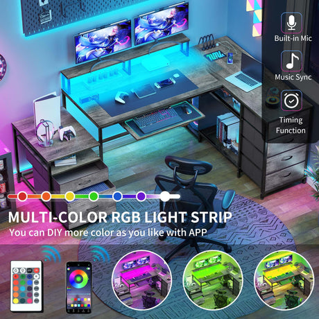 Shaped Gaming Desk with LED Lights & Power Outlets, Reversible 56" Computer Desk