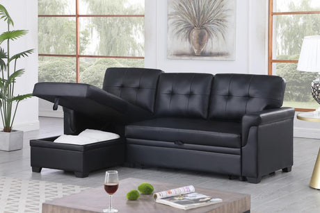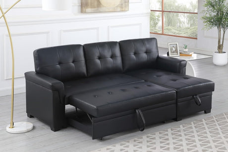 Lexi 83.5" W Black Vegan Leather Modern Reversible Sleeper Sectional Sofa with Storage Chaise