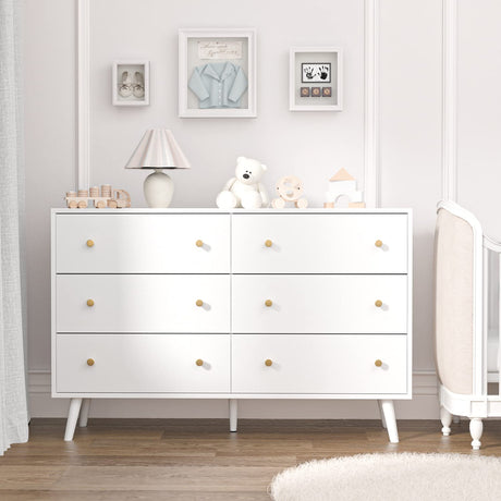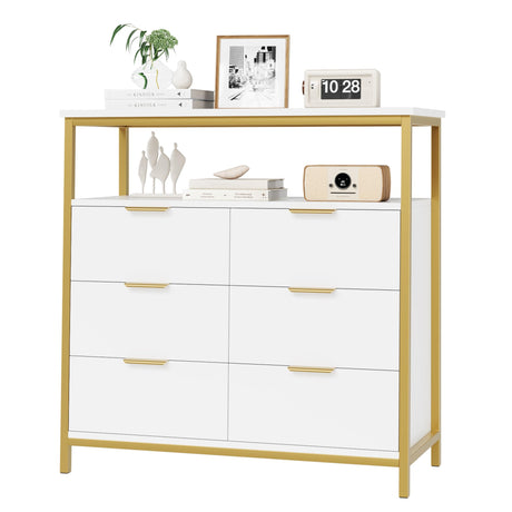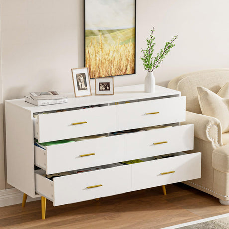 White Dresser for Bedroom, Modern 6 Drawer Dresser, Wide Chest of Drawers with Gold