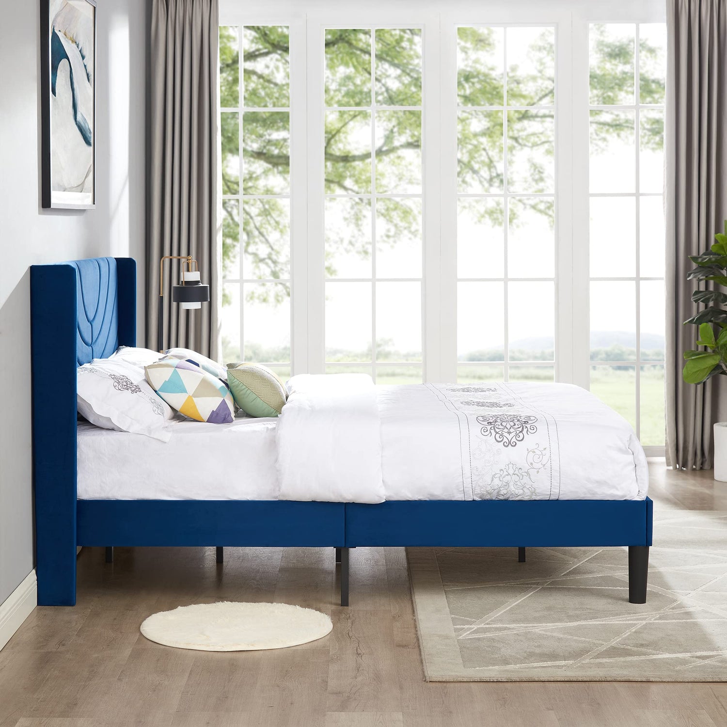 This platform bed frame offers exceptional value by combining style, comfort, and convenience. The integrated wooden slat system provides optimal mattress support while eliminating the expense and hassle of purchasing a separate box spring. The wave-pattern headboard creates a stunning focal point, while the dark blue upholstery complements a wide range of bedroom décor styles from contemporary to transitional.