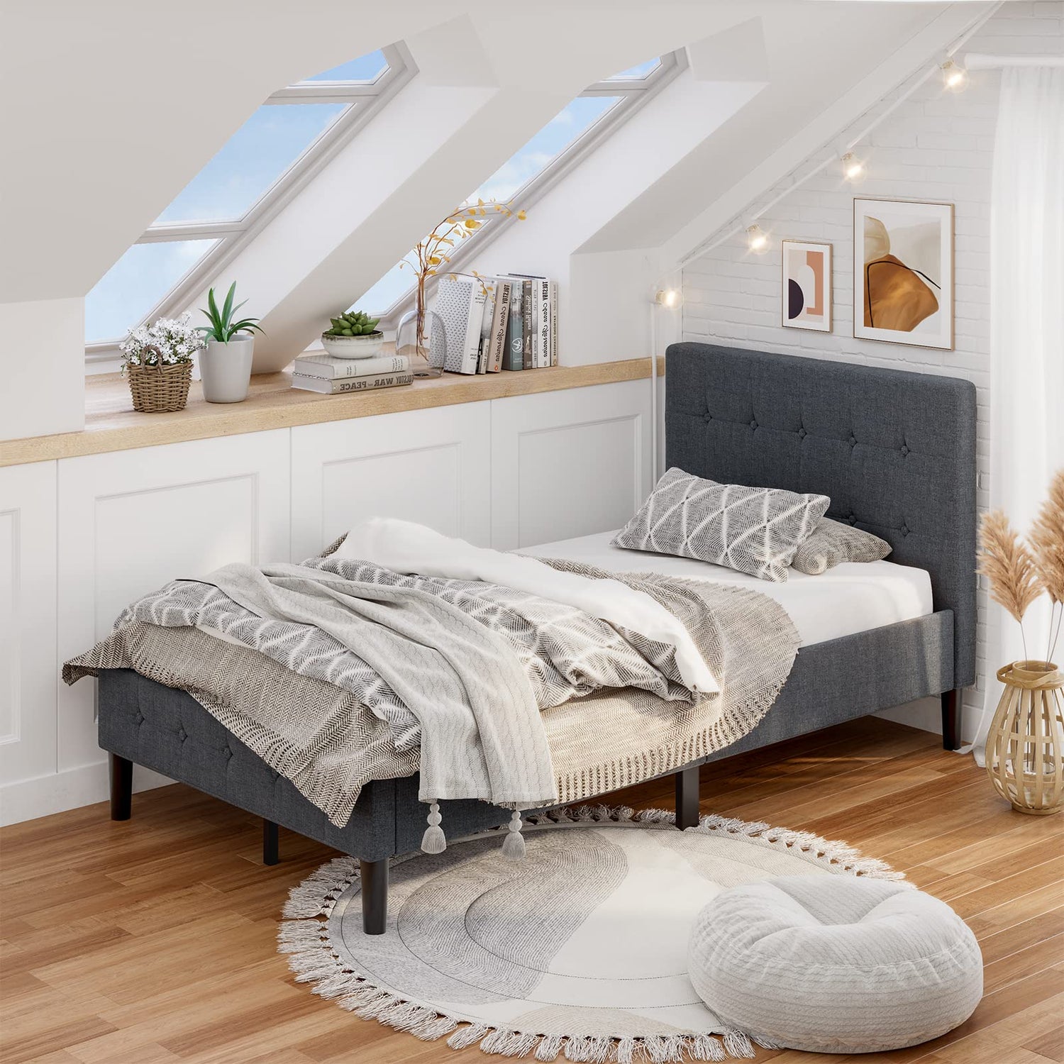 Twin Upholstered Bed Frame with Button-Tufted Headboard - Grey