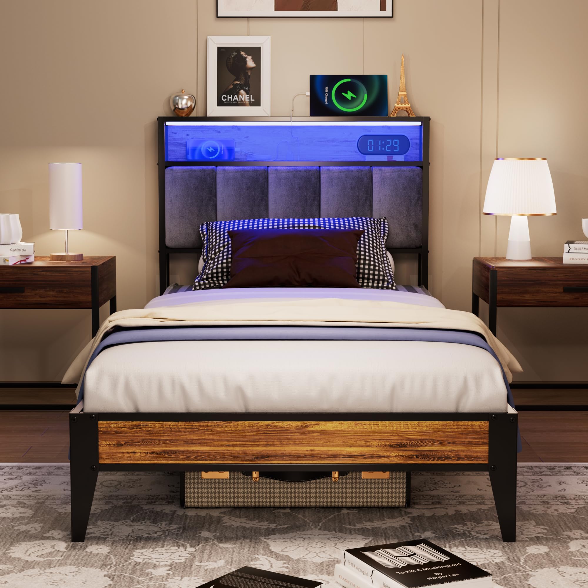Twin Frame, Metal Platform Twin Size Bed Frame with Storage & LED Light Headboard