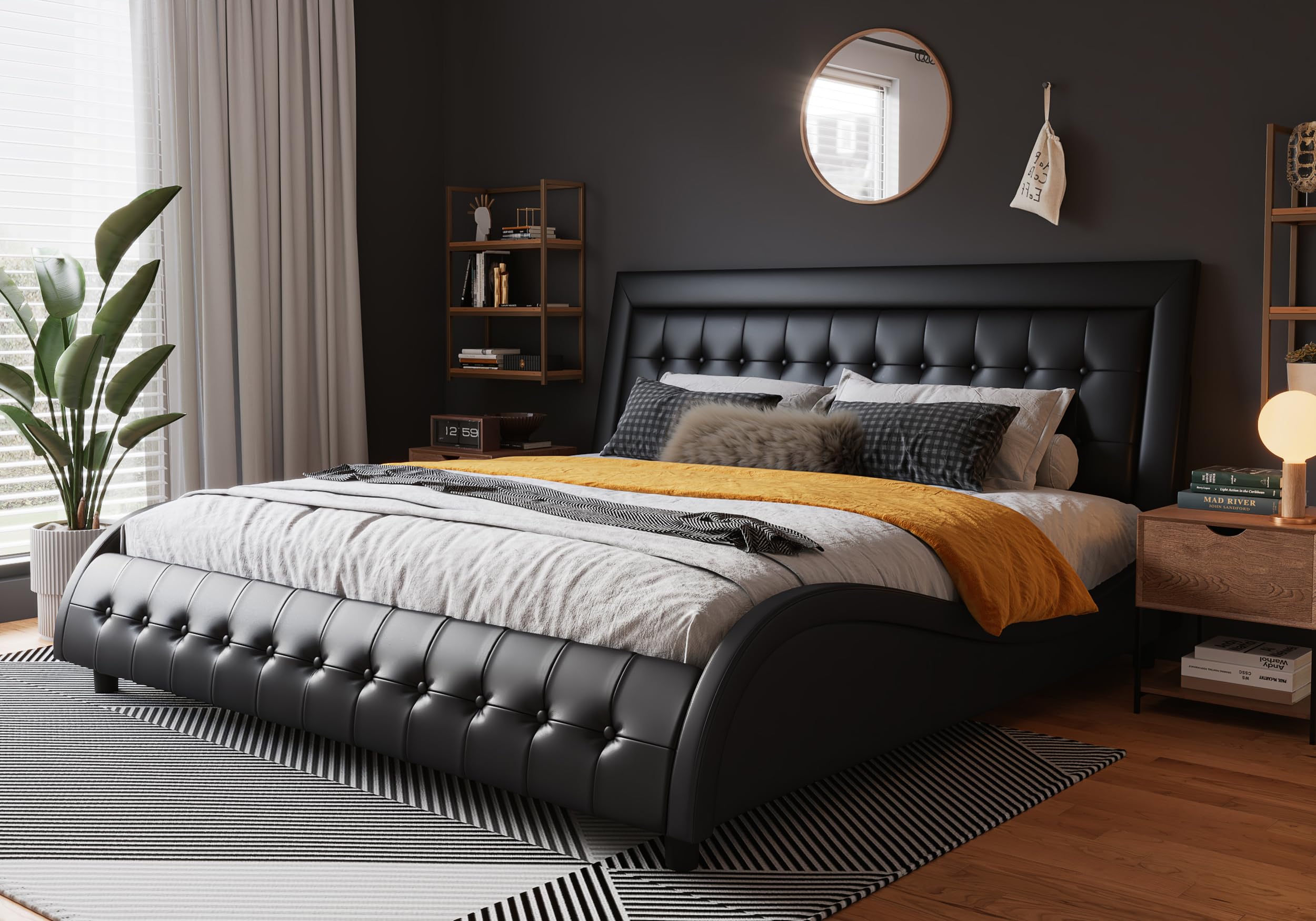 King Size Box-Tufted Platform Bed Frame/Faux Leather Upholstered Bed Frame