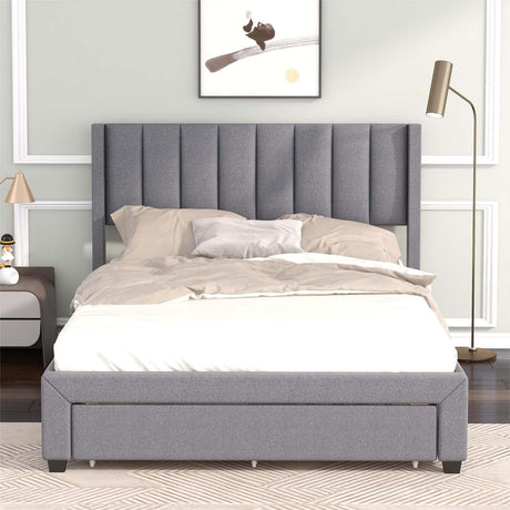 Upholstered Platform Bed with a Large Drawer in Footboard and 2 Drawer on Side,