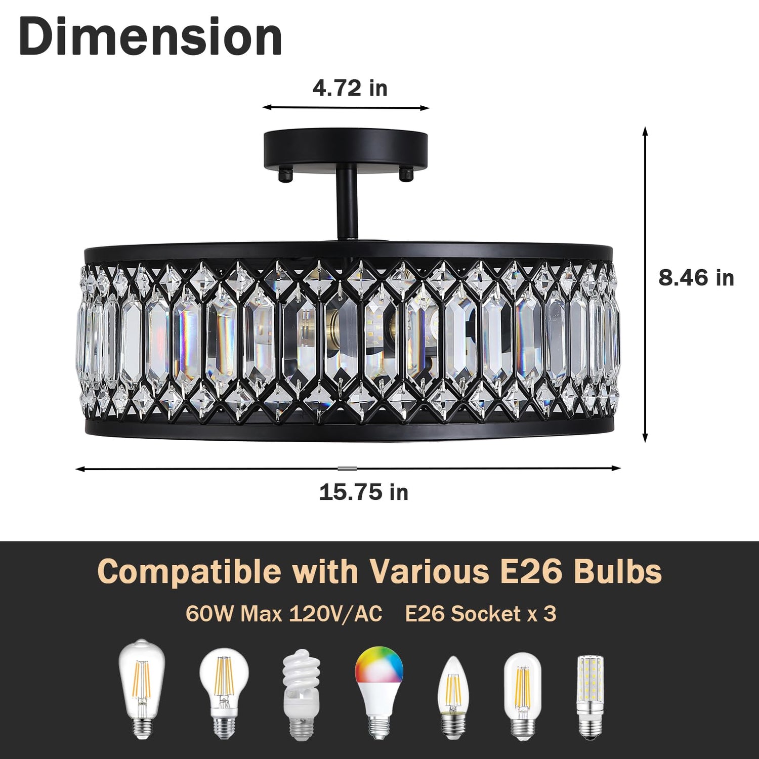 16" Black Crystal Ceiling Light - 3-Light Semi Flush Mount Chandelier
