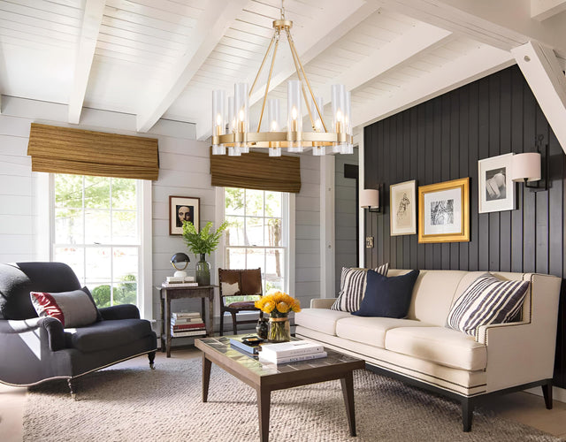 • Gold Farmhouse Chandelier: This farmhouse chandelier is rustic and industrial in style and comes with 8 elegant glass shades. The structure is sturdy and the gold finish creates a classic minimalist aesthetic. This golden chandelier fixture can be used in a variety of spaces such as kitchen islands, bedrooms, hallways, dining tables, living rooms, entrances, farmhouses, and offices.