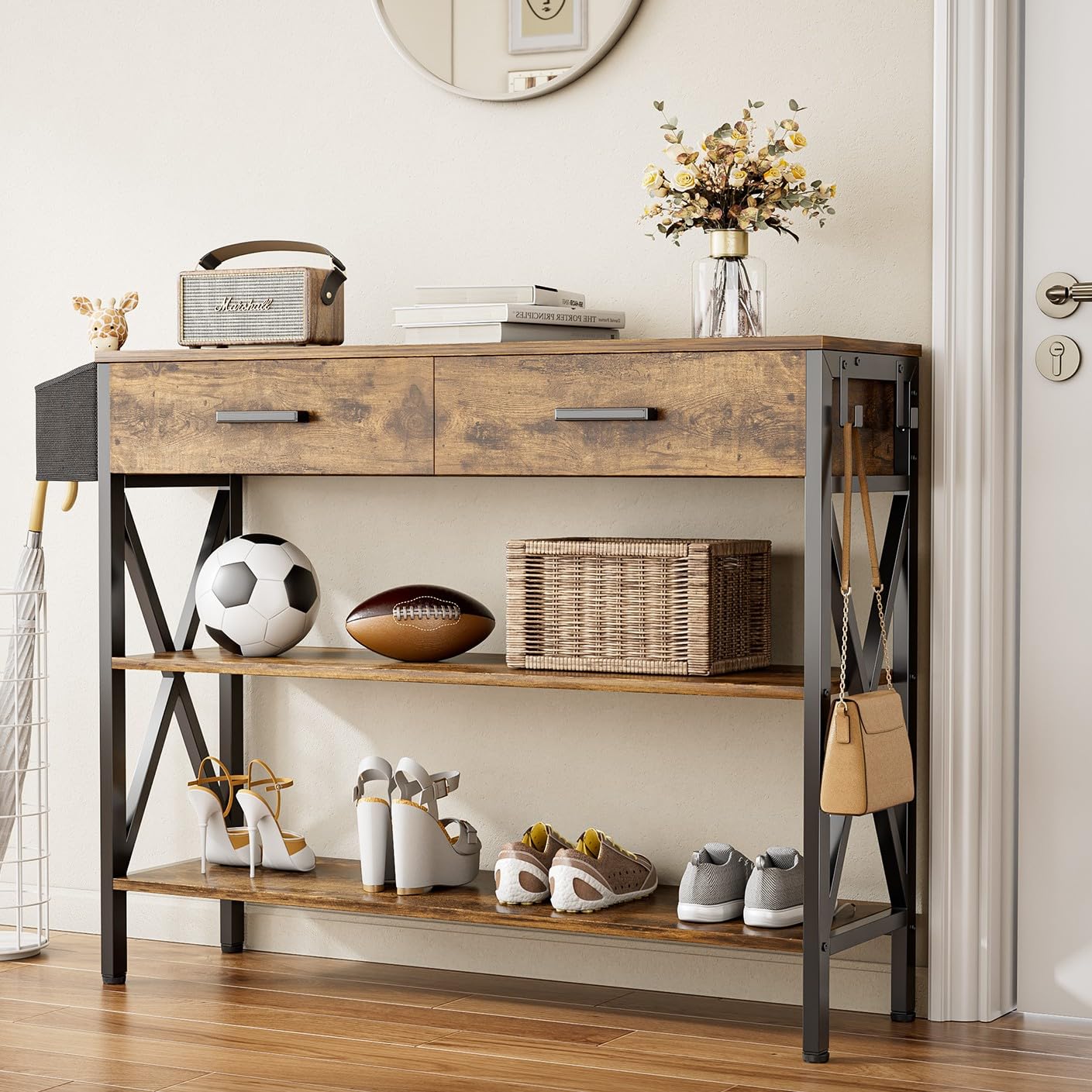 39" Console Table with 2 drawers, Industrial Entryway Table with 3 Tier Storage Shelves,