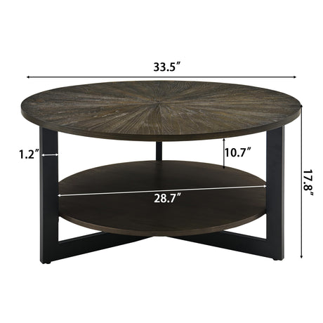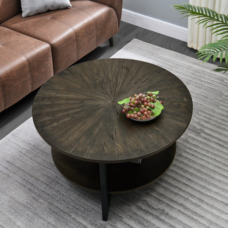 25.6" Dark Walnut White Round Farmhouse Coffee Table, 2-Tier Storage Wood Center