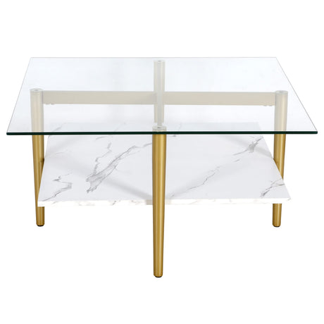 32" Wide Square Coffee Table with Faux Marble Shelf in Brass