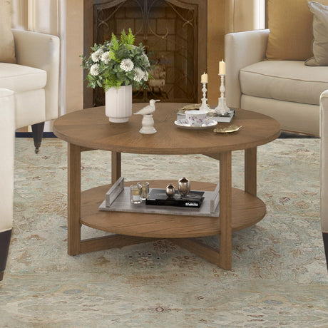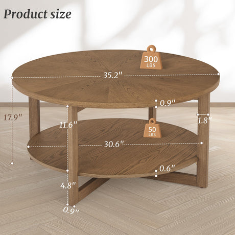 Round Coffee Table, 35" Rustic Modern Circle Coffee Tables with 2-Tier Storage Shelf