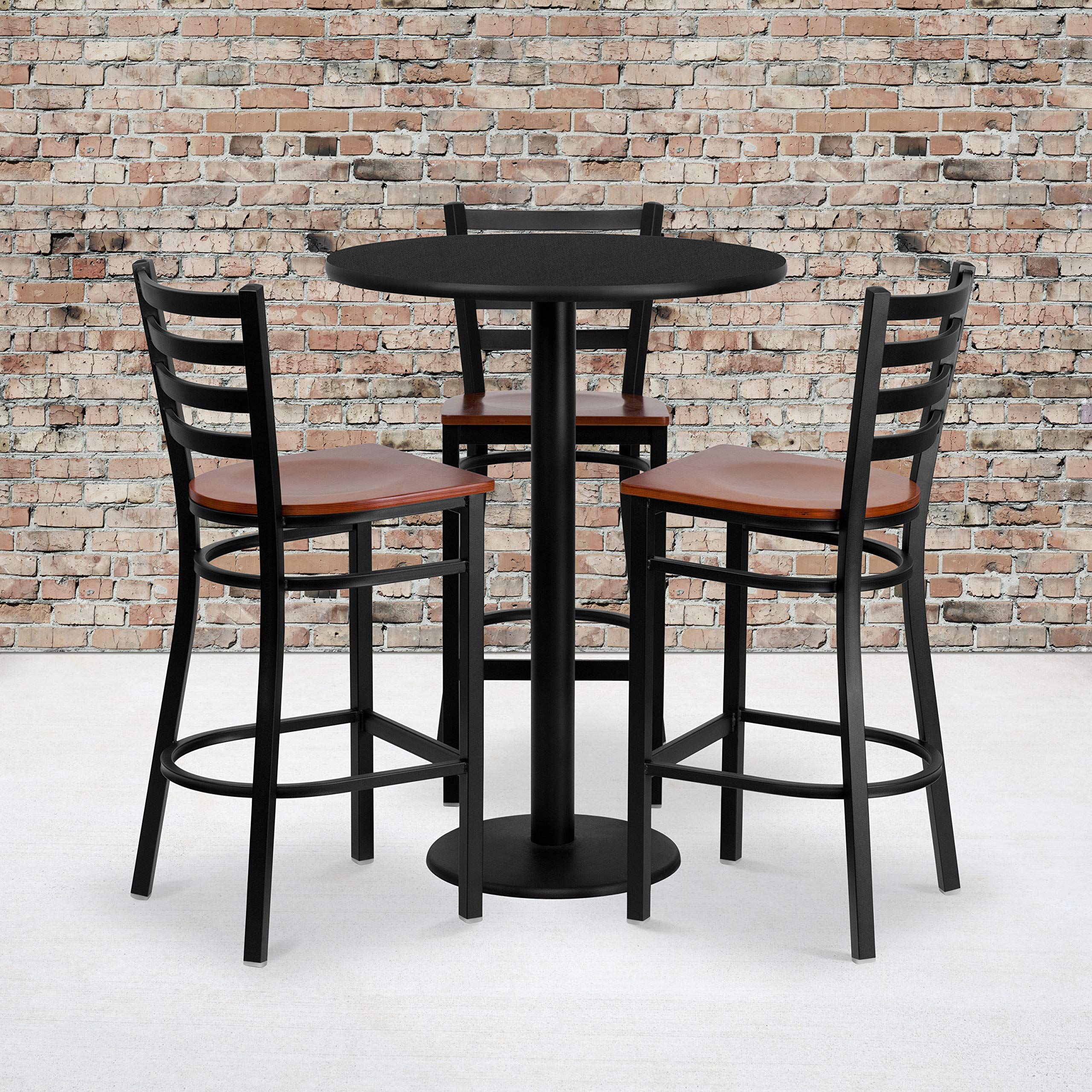 30'' Round Black Laminate Table Set with 3 Ladder Back Metal Barstools - Cherry Wood
