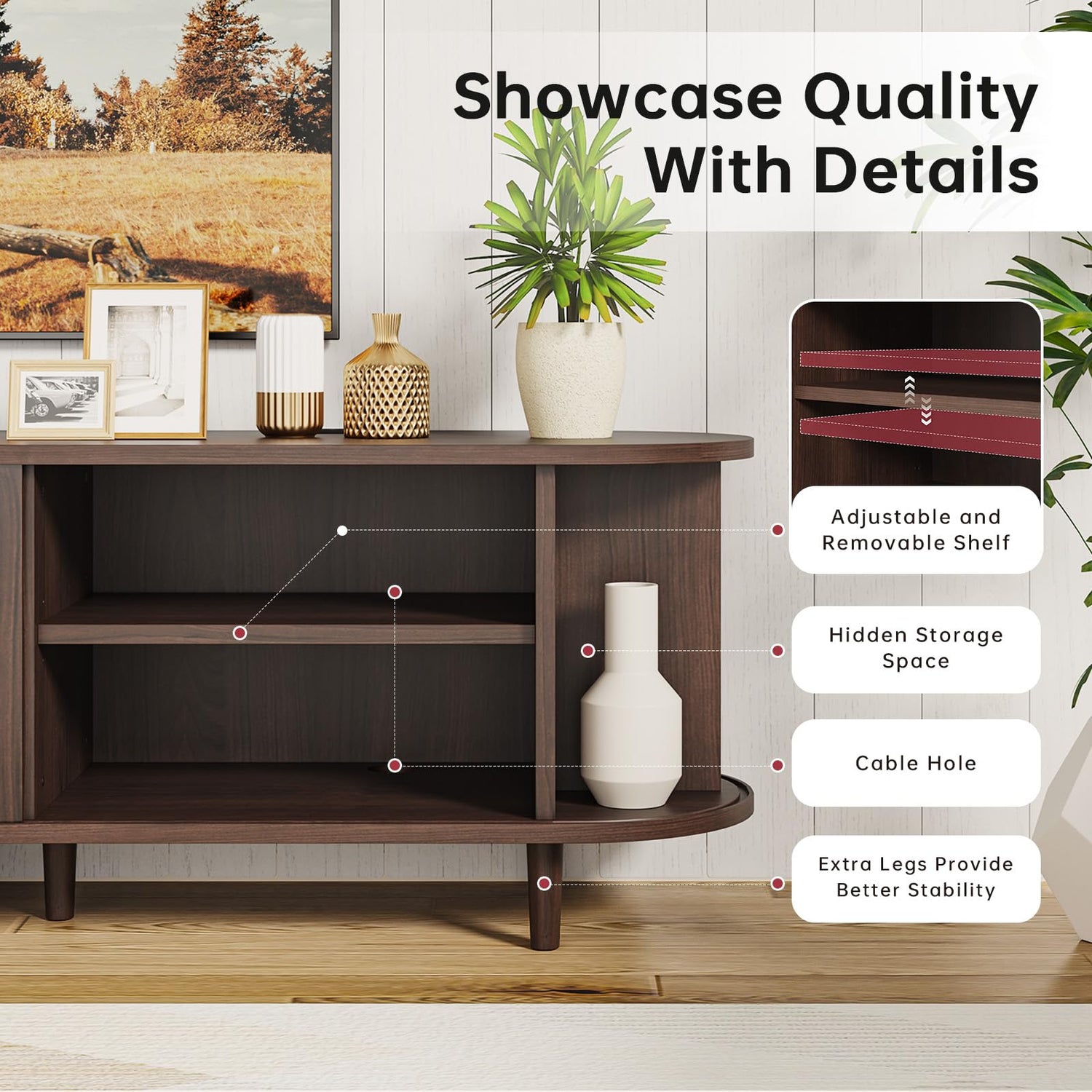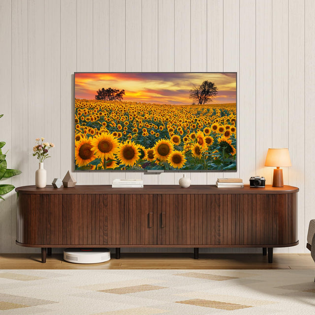 Elevate your living space with this sophisticated 70-inch entertainment center that seamlessly blends mid-century modern design with contemporary functionality. Featuring distinctive fluted sliding doors and a rich walnut finish, this TV console accommodates screens up to 75 inches while providing versatile storage solutions.