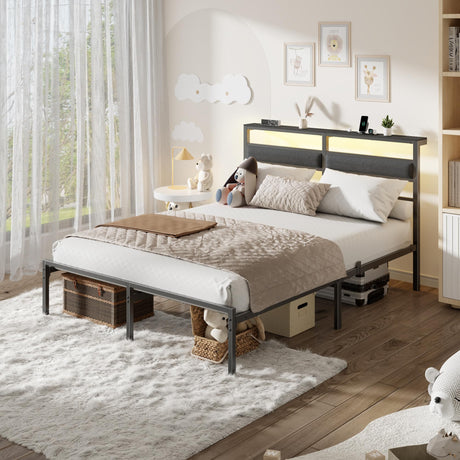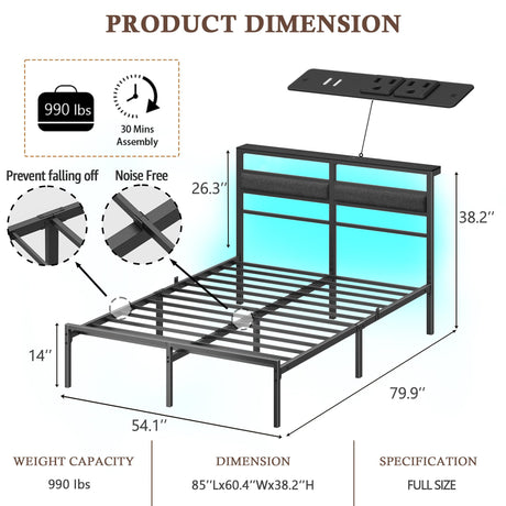 Full Size Metal Bed Frame with RGB LED Lighting & Charging Station