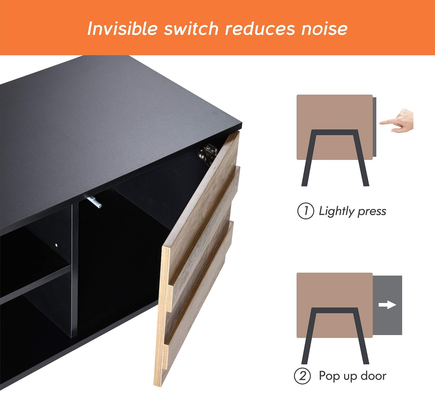 The two-tone black and brown wood finish creates a striking contrast, while sturdy metal legs provide both stability and an industrial-modern edge. This versatile media console offers ample storage and display space for your entertainment components, gaming systems, and decorative accents.