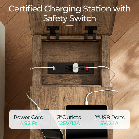 Farmhouse End Table Living Room, Side Table with Charging Station & Adjustable Storage