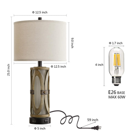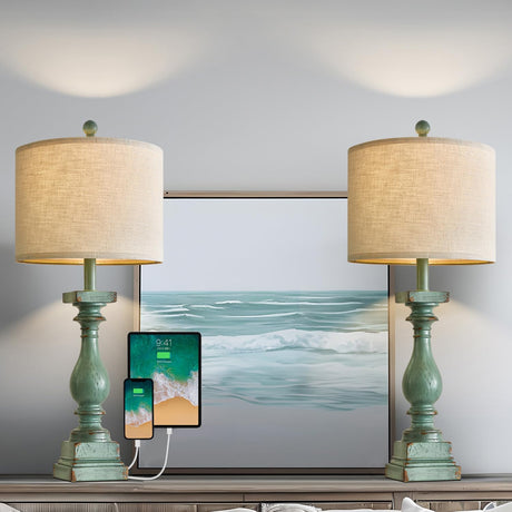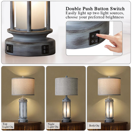 27" Farmhouse Table Lamp Set of 2 with USB A+C for Bedroom Living Room Vintage Rustic