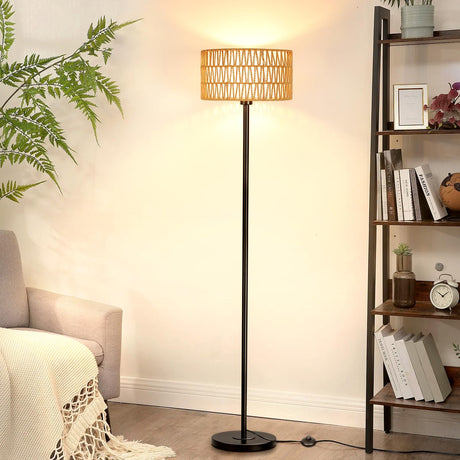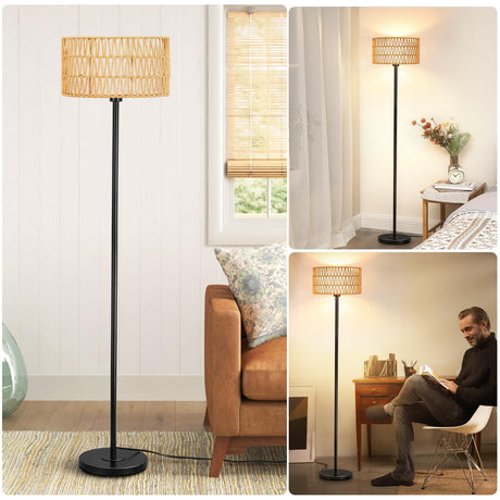 Lamps for Living Room, Rattan Boho Floor Lamp, Black Metal Floor Lamp with LED Bulb,