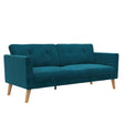 - Built for small spaces, its sturdy 3-seater wood frame with center support leg, open arms, button tufted back, tall wooden legs and relaxed sofa cushions make entertaining guests a delight