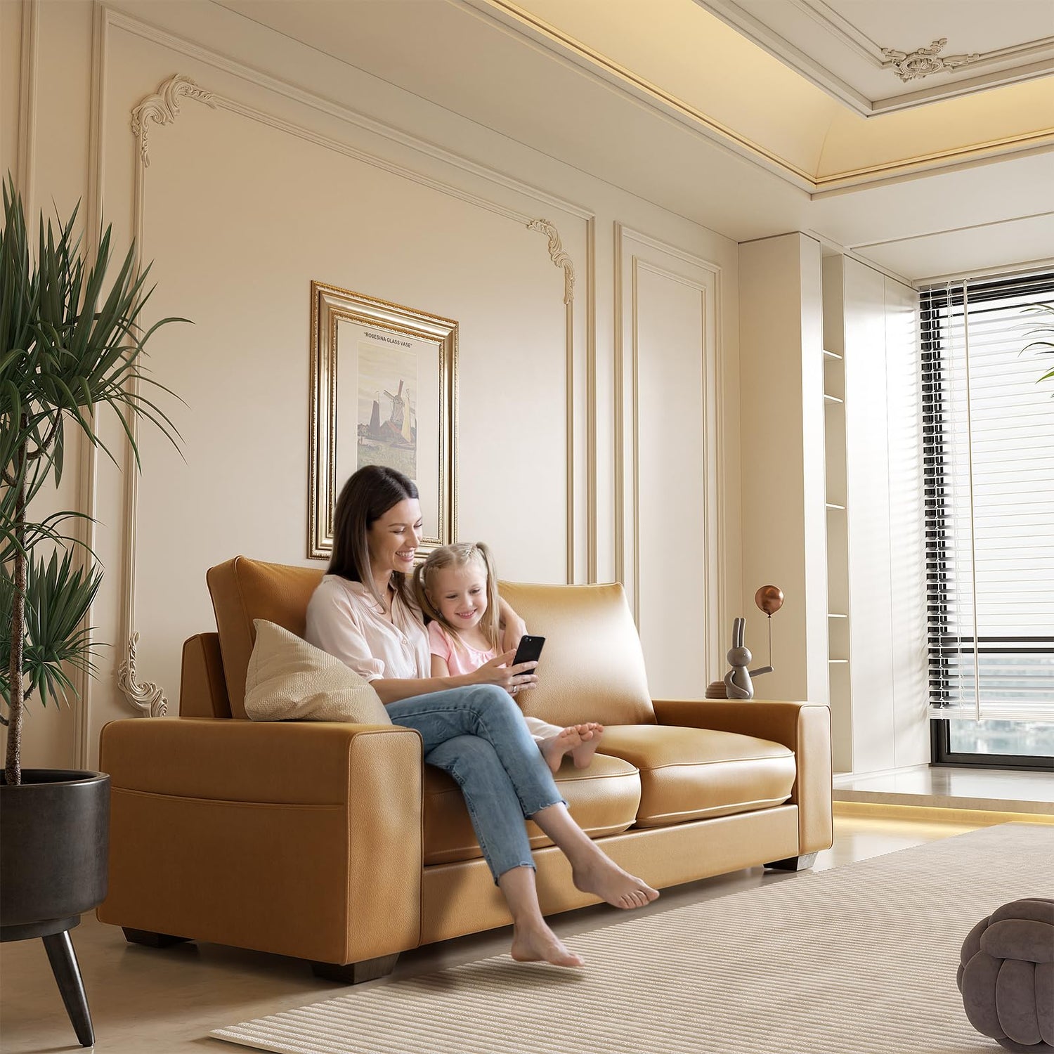 - [Convenient Storage and Easy Maintenance] Our modern sofa couch has functional storage compartments on both sides, making it easy to store periodicals, tablets, and other everyday needs. Our mid-century couch is composed of high-quality, skin-friendly imitation leather that is simple to clean—just wipe away stains with a wet cloth for easy upkeep.