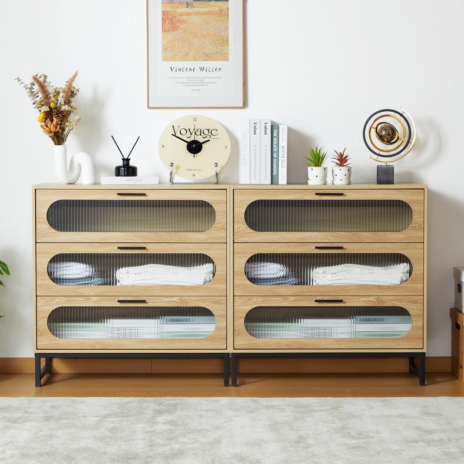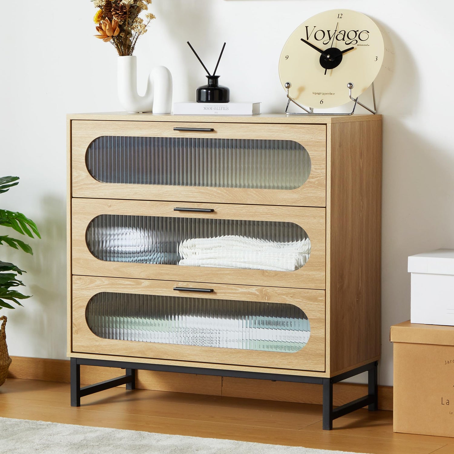 3 Drawers Dresser, Wooden dresser with Tempered Glass Drawers and Metal Handle