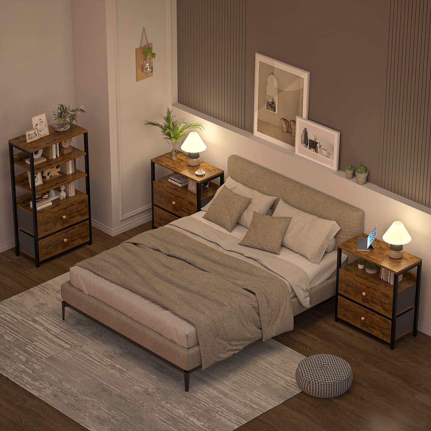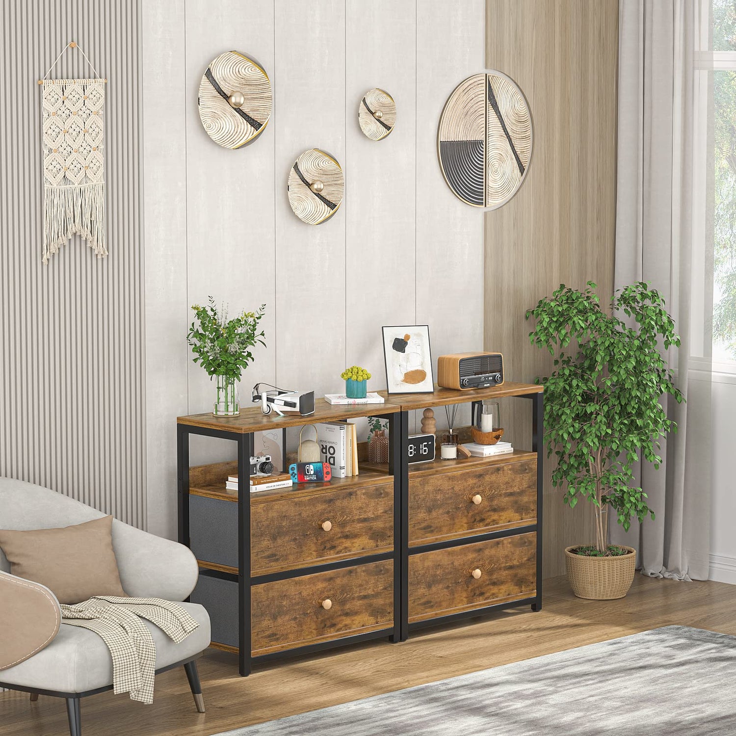 • Industrial Dresser: Do you need a dresser to keep your bedroom tidy? Armocity bedroom dresser with black frames, rustic wooden board, and fabric drawers is a good option for you, which gives your room a unique look.