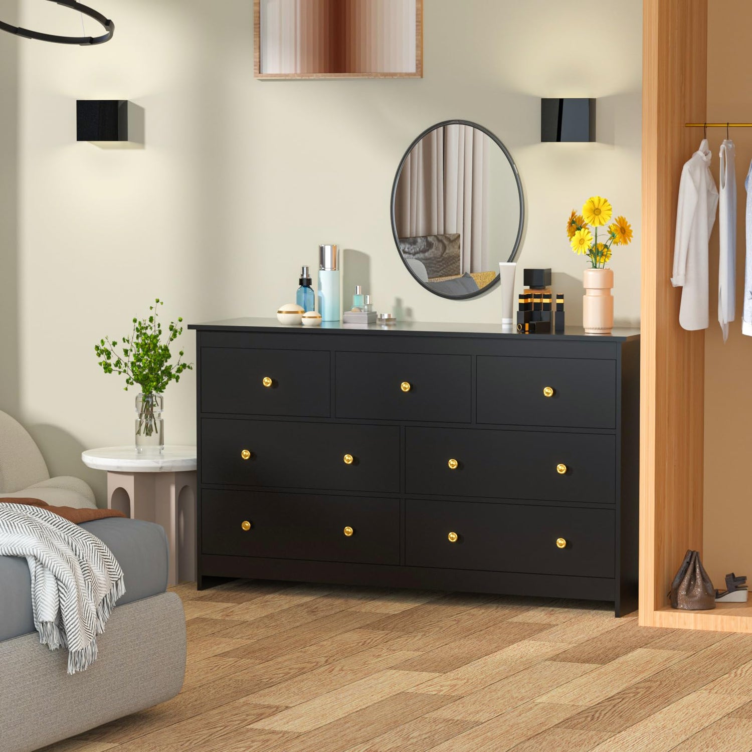 - The sleek black finish and classic gold knob handle provide a unique finish while sure to add a glamorous look to your room and provide an easy storage idea for your room. Black modern dresser complements any contemporary interior perfectly. Use alone or with other bedside tables, a high cabinet combination is a good choice. 7 drawer dresser brings a retro modern twist to your furniture decor.