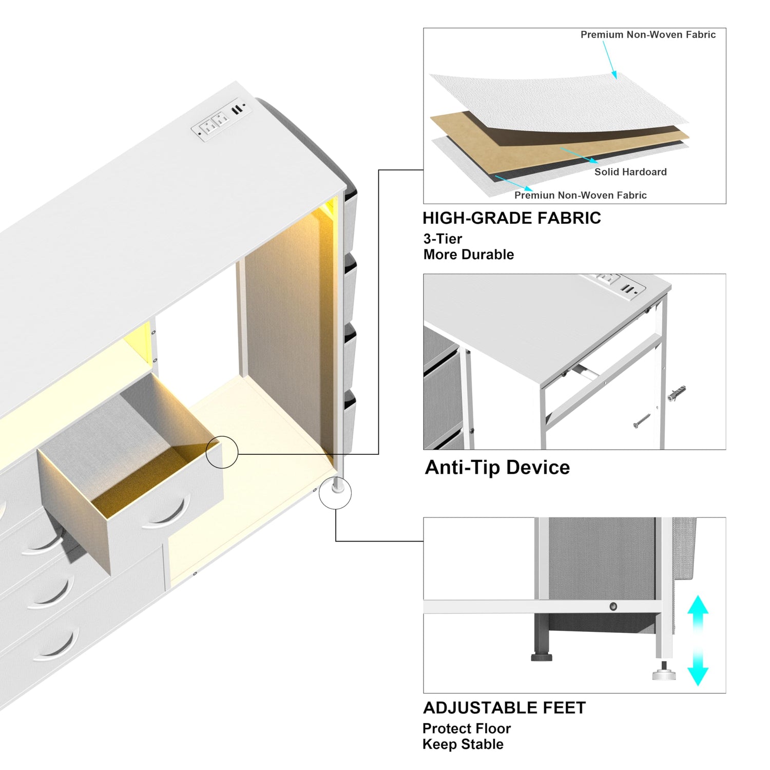 • Built-In Charging Station: The tall dresser includes a practical charging station, complete with a desktop housing 2 USB ports and 2 AC outlets. This allows you to charge multiple devices, including mobile phones, laptops, or table lamps, etc. And conveniently within arm's reach